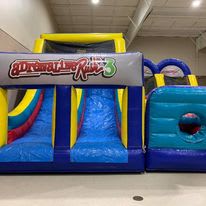 Adrenaline junky? Check out our Adrenaline Rush Obstacle Course. This unit features a curved obstacle area, a rock wall, and dual lane slide. Perfect for any event!