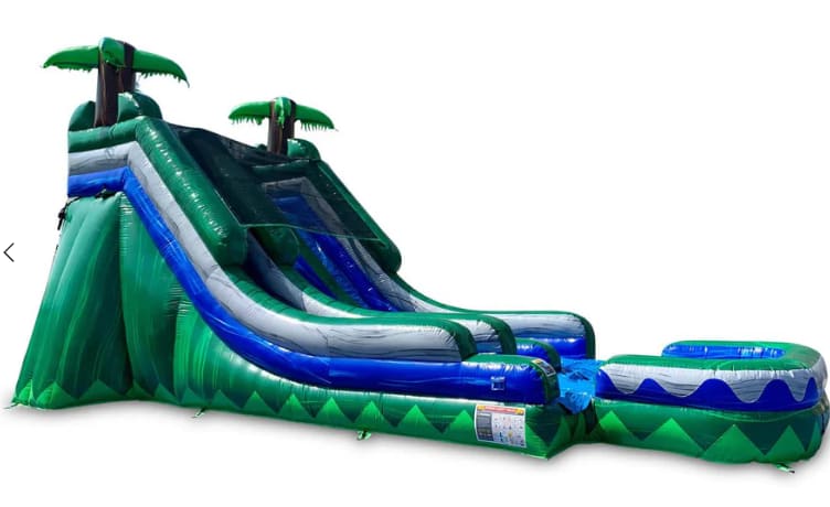 Our 18' tall Hawaiian Tropical Inflatable Dual Lane Slide (Wet/Dry) is a summertime must-have. Great for all events and ages. The dual slide has two inflatable palm trees at the top of each slide, perfect for tropical-themed parties. Use the non-slip stairs to climb to the top and have the option of not one but two slides, and you slide into an inflated pool. Our slides have a safety netting at the top of the slide, which includes a water mister. It can be used wet or dry any time of the year.